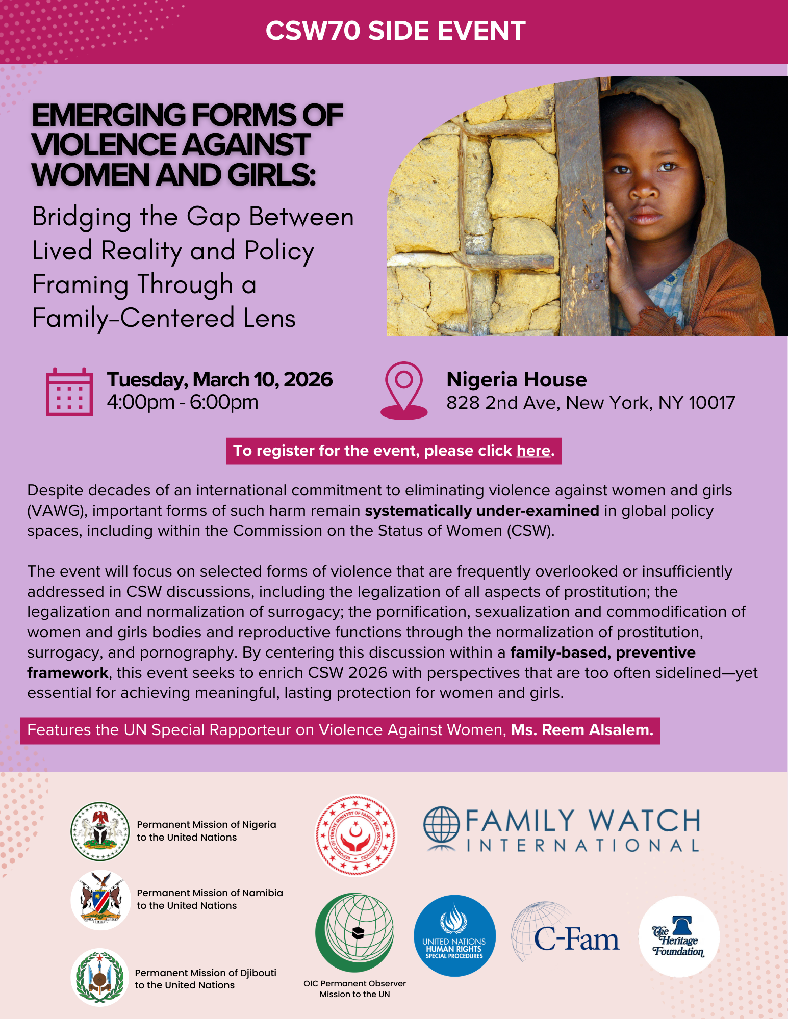 By centering this discussion within a family-based, preventive framework, this event seeks to enrich CSW 2026 with perspectives that are too often sidelined—yet essential for achieving meaningful, lasting protection for women and girls.